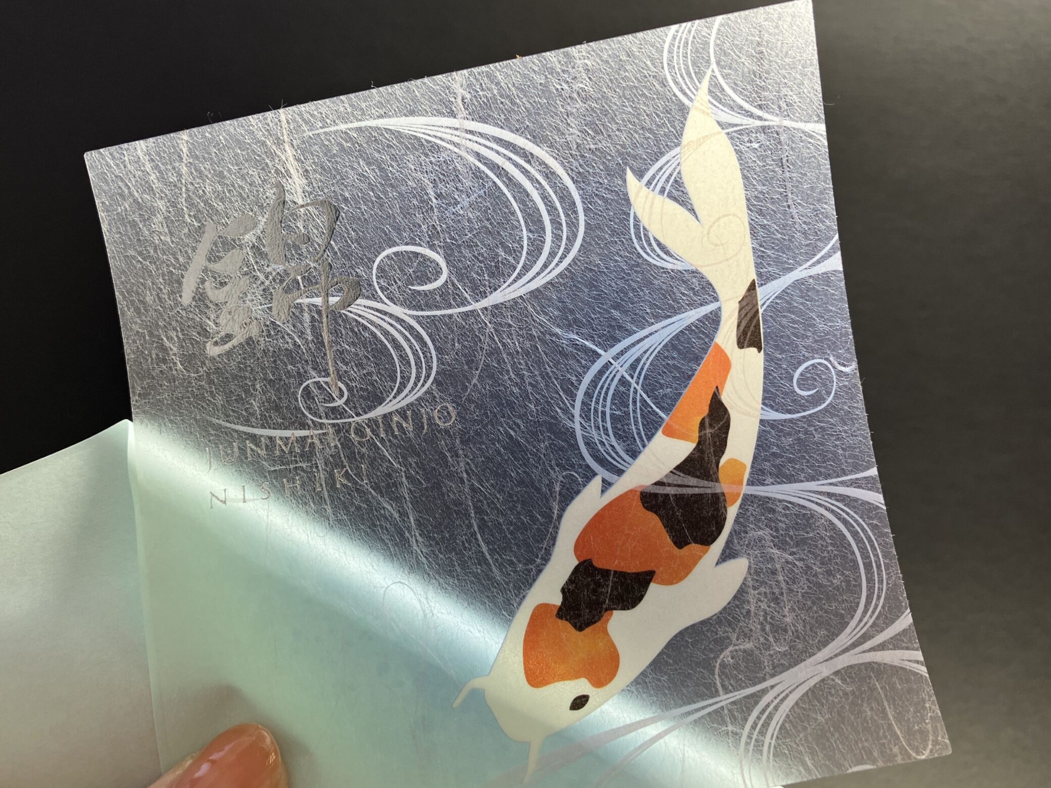 工程としては、透明PETにカラー4色と白で水の青と錦鯉を印刷し、その上から雲龍和紙ラミネートを貼り合わせています。これだけでも十分に鯉の美しさと和風のイメージを再現できましたが、更に日本画を思わせる水の流れを白い線で表現しました。