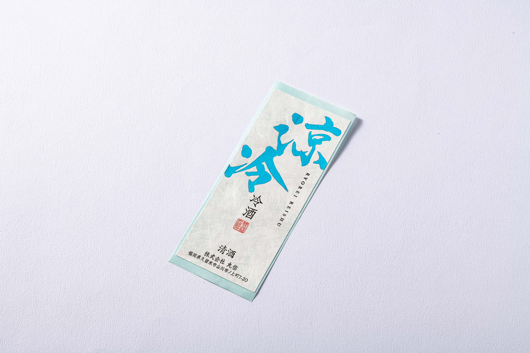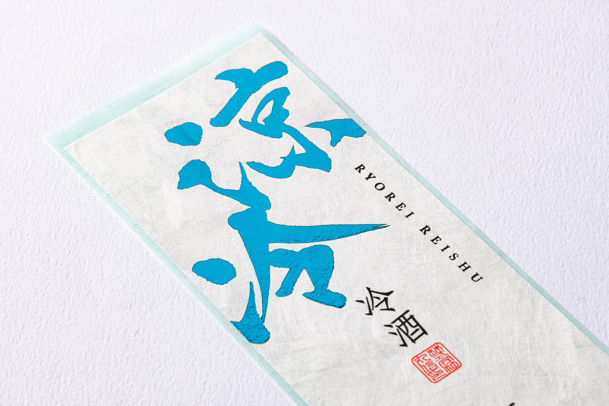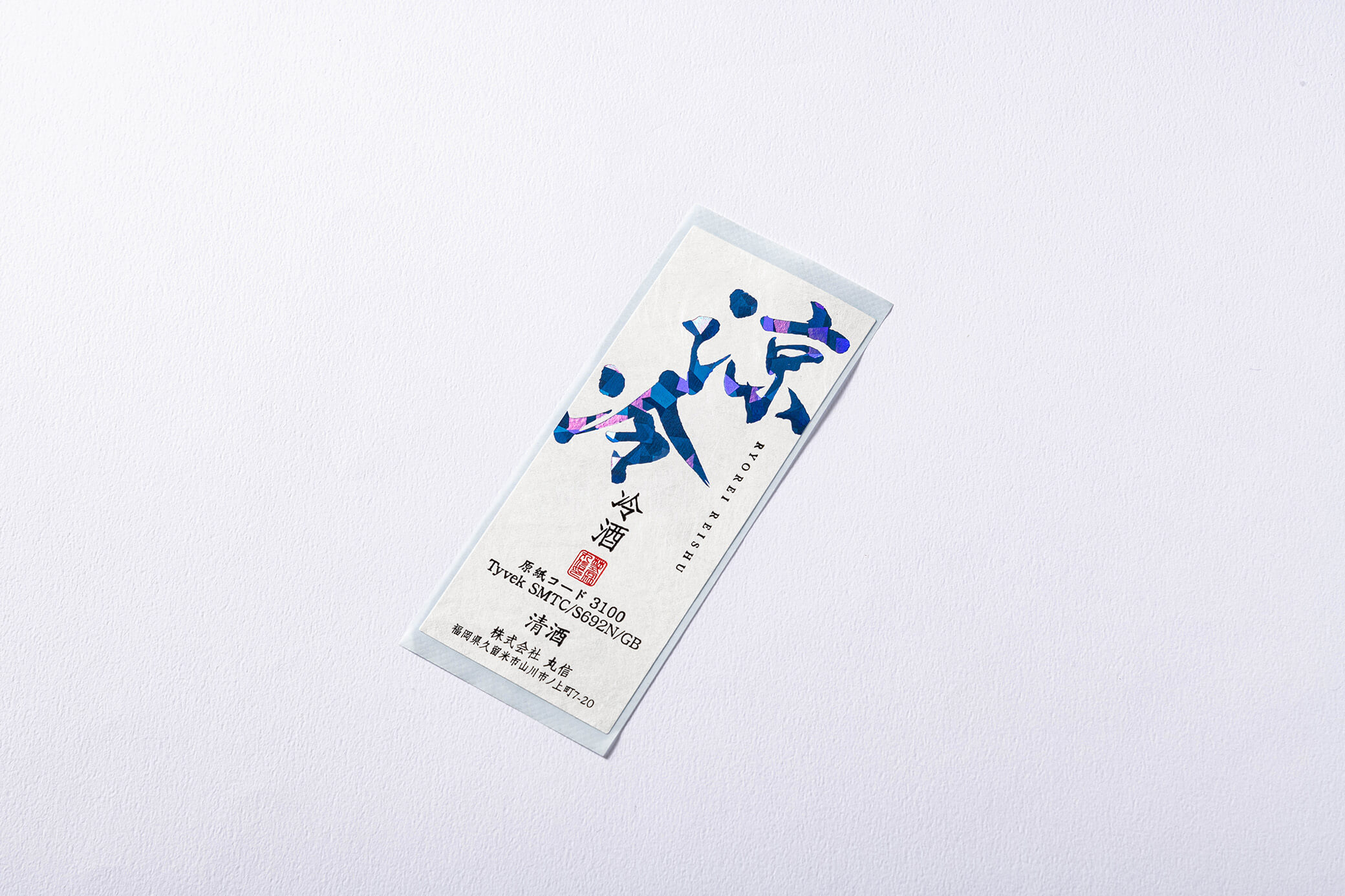 涼やかで夏にぴったりな冷酒の瓶ラベルの事例です。デザインは当社デザイナーが手がけ、商品の魅力である清涼感を、流れるような書体とホログラムの青箔とスカイブルー箔で表現したサンプル用のラベルです。
