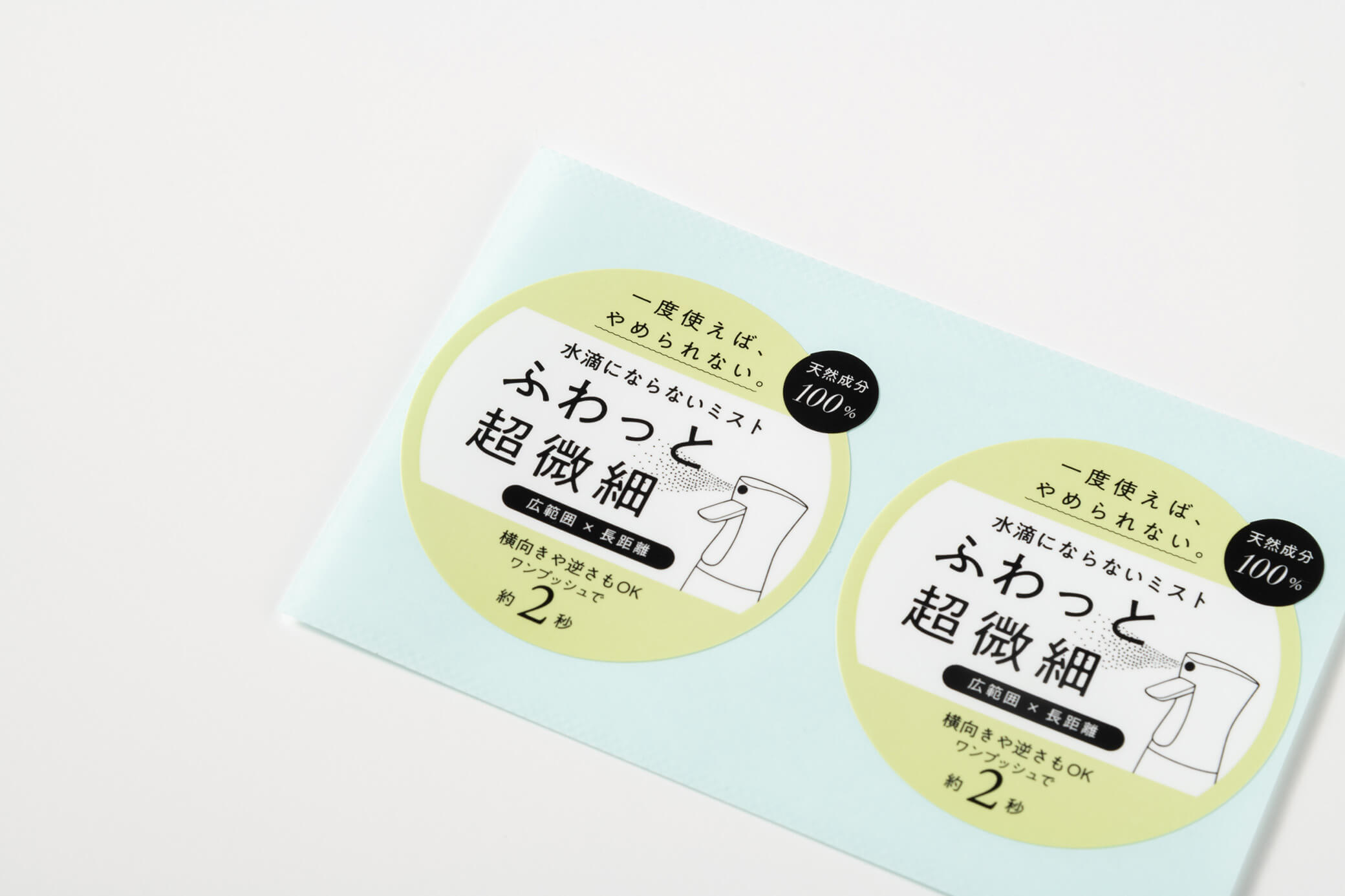 ミスト商品の特長を、やさしく印象づけるアテンションシールの事例です。