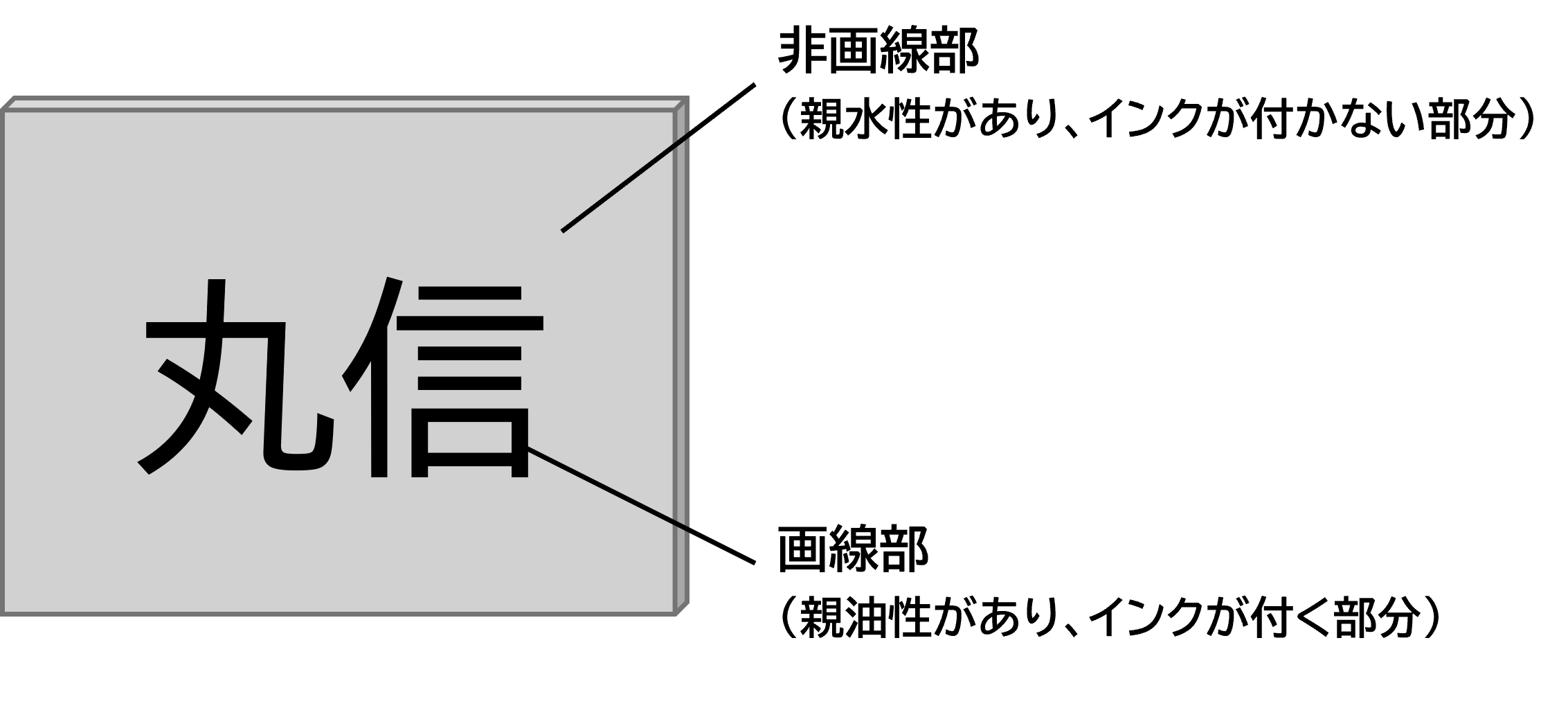 印刷しない部分は水を吸収し、印刷する部分は水をはじきます。
