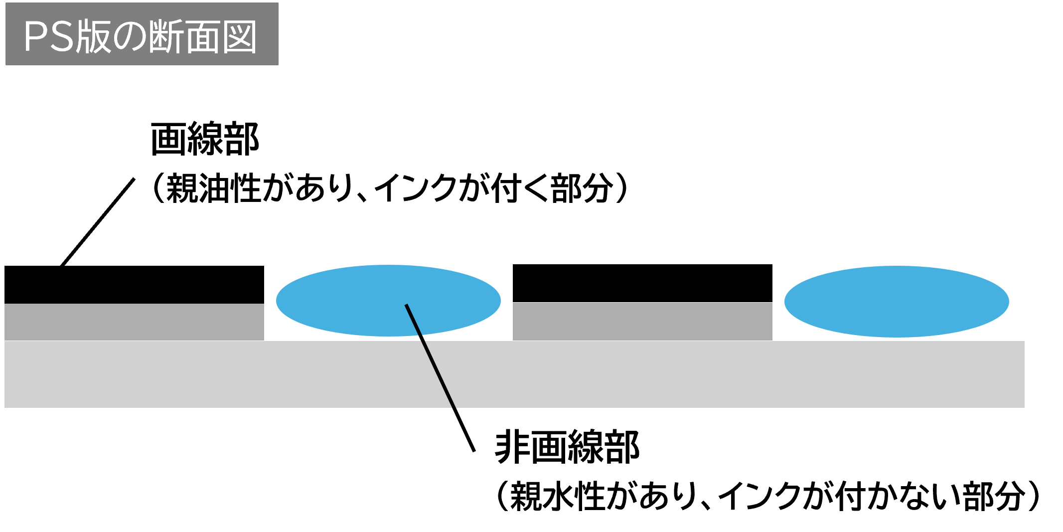 オフセット印刷では「PS版」という平らなアルミの版を使用します。この版は、画線部(親油性のある部分)と非画線部(親水性のある部分)に分かれており、印刷したい部分は画線部、印刷しなくていい部分は非画線部の加工がなされています。