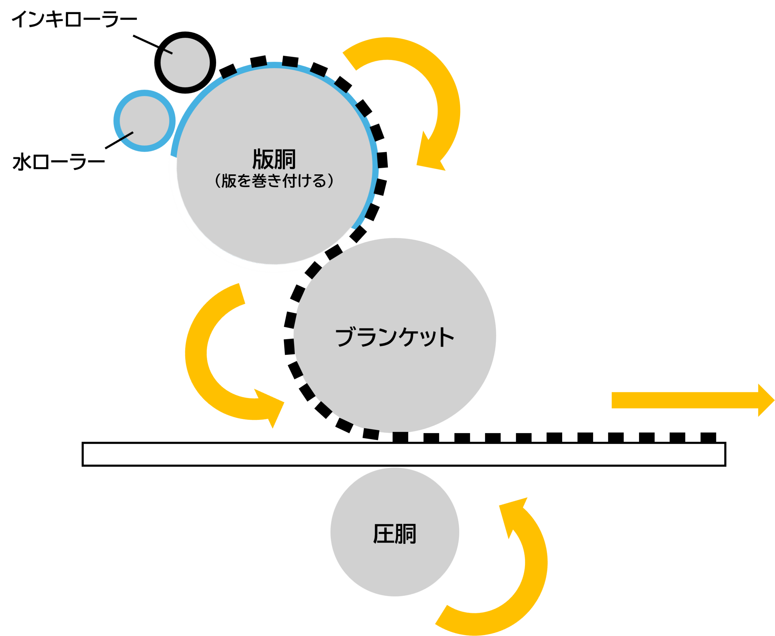 版からゴム製のブランケットにインクが転写され、それを紙に印刷します。