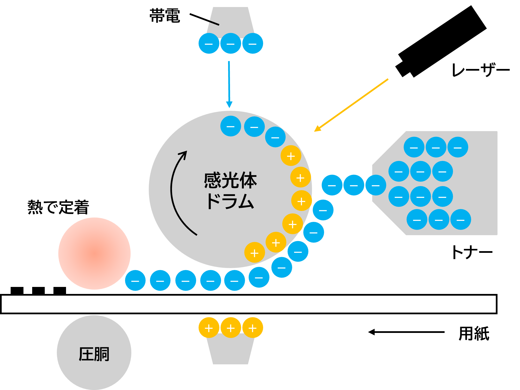 ③マイナスの電荷を帯びたトナーをドラムに吸着させ、強いプラスの電荷で紙に転写します。