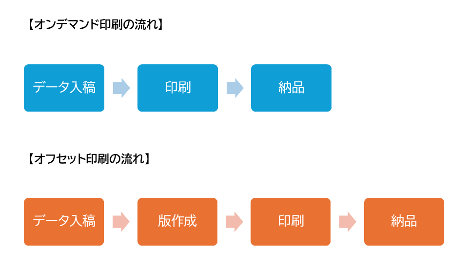 小ロットで短納期をご希望の場合はオンデマンド印刷、大ロットで品質にこだわりたい場合はオフセット印刷と覚えておくとよいでしょう。