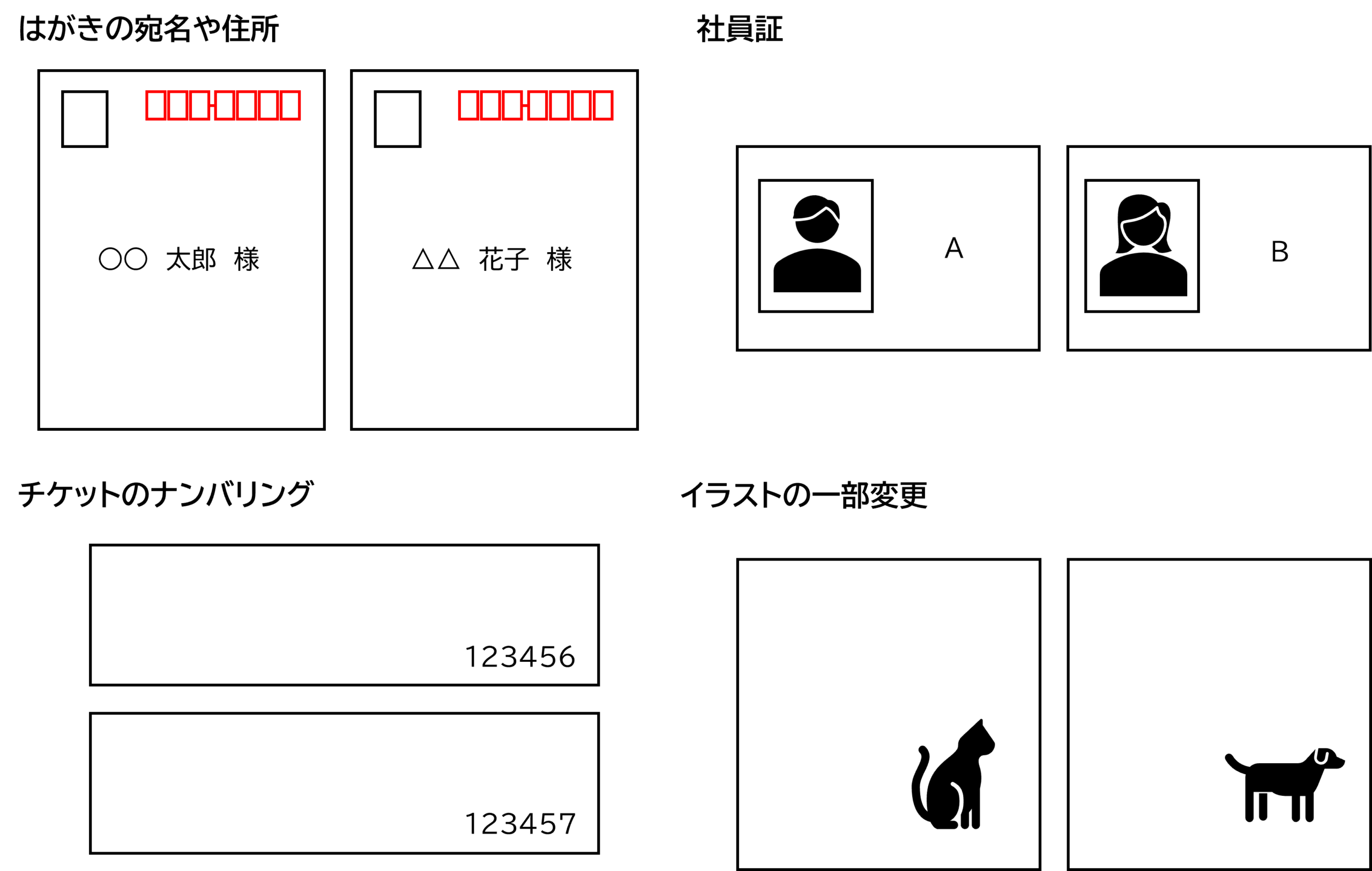 「一部分だけイラストや文字を変えて印刷したい」という場合、オフセット印刷だと版を変えなければならず、その分コストや時間がかかりますが、オンデマンド印刷はデータを準備すれば印刷できます。